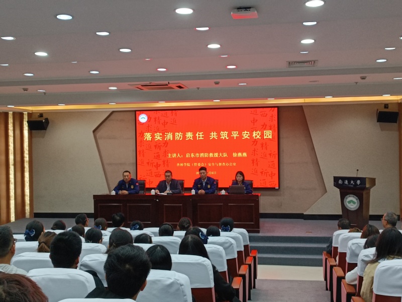 为全面推进启东校区“119”消防宣传月工作,切实筑牢校园安全防线,11月6日上午,安全与督查办公室特邀启东市消防救援大队参谋王羿皓一行来校,开展主题为“落实消防责任、共筑平安校园”的消防安全知识讲座。杏林学院副院长吴甲出席活动并讲话。