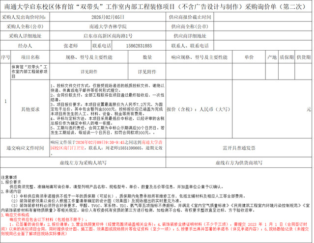 1.南通大学启东校区体育馆“双带头”工作室内部工程装修项目采购询价单(第二次)